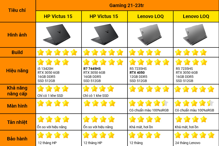 Tổng kết lại, HP Victus 15 fb3116AX BX8U4PA là một lựa chọn rất đáng cân nhắc dù vẫn còn vài hạn chế, nhưng bù lại bạn có một cấu hình Ryzen 7 và RTX 3050 6GB rất khỏe trong tầm giá này. Đây sẽ là một chiếc máy hoạt động ổn định, vừa đủ lịch sự để mang đi làm, lại vừa đủ mạnh để giải trí sau những giờ học tập và làm việc căng thẳng.
