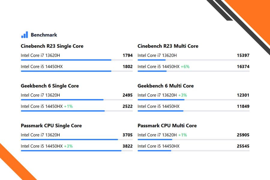 Về hiệu năng đa nhân và đơn nhân, i7-13620H thường dẫn trước i5-14450HX ở điều kiện tương đồng vì bộ nhớ đệm lớn hơn và dòng H thường có thiết lập cho máy mỏng nhẹ hơn chứ không tập trung vào tản nhiệt cực mạnh như dòng HX. Các bản benchmark cho thấy i7-13620H đạt số điểm đa nhân cao, ví dụ Geekbench hoặc Cinebench đều cho kết quả tốt.