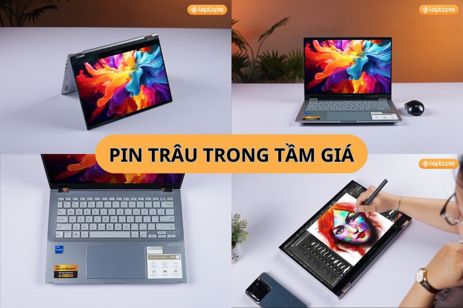 Vivobook 15X OLED là phiên bản cân bằng giữa hiệu năng mạnh và pin lâu. Thời lượng pin đạt từ 9 - 11 tiếng nhờ chip Intel P-series và màn hình OLED tiết kiệm năng lượng. Máy đặc biệt phù hợp với người làm sáng tạo nội dung nhẹ hoặc nhân viên văn phòng cần hiệu năng cao nhưng không muốn phải mang sạc liên tục.